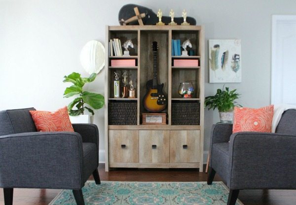 We are in love this Cannery Bridge Storage wall piece. It is perfect for open and closed storage. I added a few baskets from my basket stash, they fit perfectly. The shelves are adjustable, you can seen how I left the center open for the guitar.