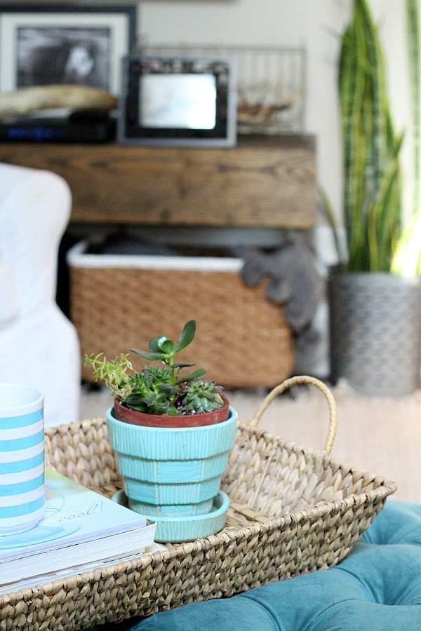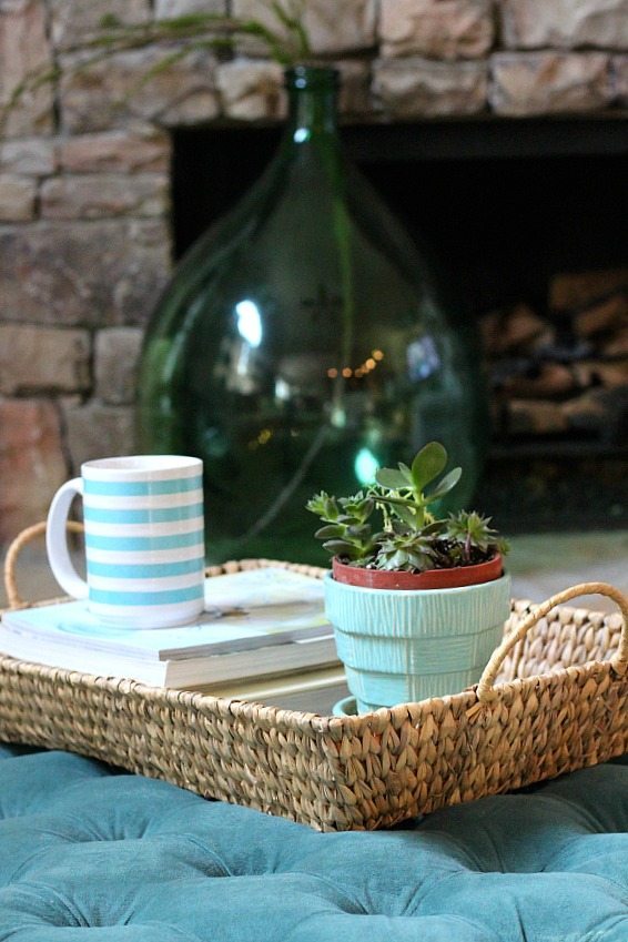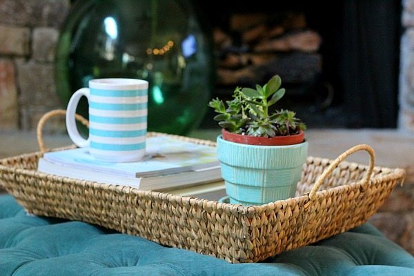 A basket tray on my ottoman, it’s great for holding the important stuff…coffee cups and magazines.