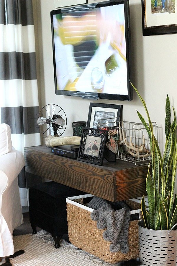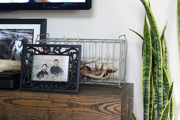 In the TV corner, there’s one for throws and antlers.