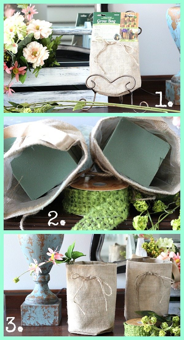 On one of my recent outings, I was cruising the isles of Hobby Lobby and I came across these burlap grow bags. They were around $3 each and I thought it would be cool to grow something in a burlap bag, lined with plastic with drain holes. Yep, I was going to create a live door decor, just like I did here.