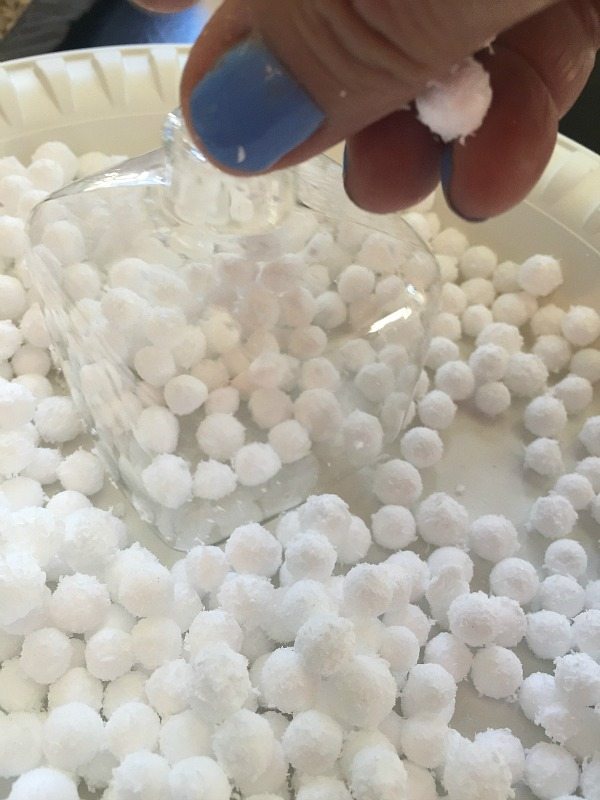 Take the hanger off and fill with tiny snowballs, remember I said this was easy! Add the sticker and attach the ribbon for hanging.