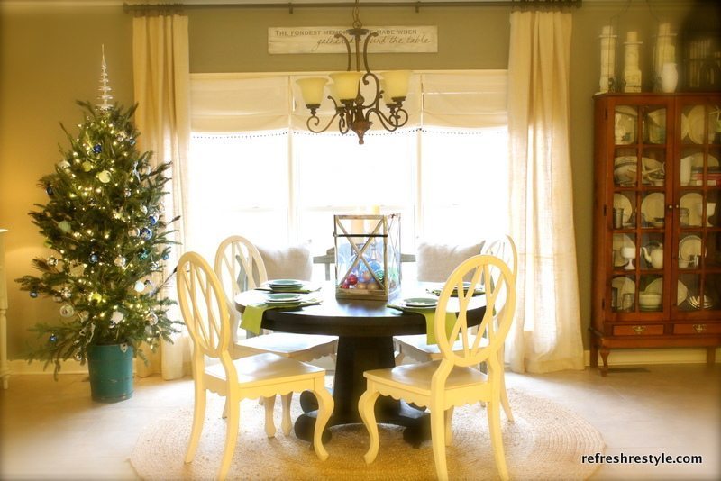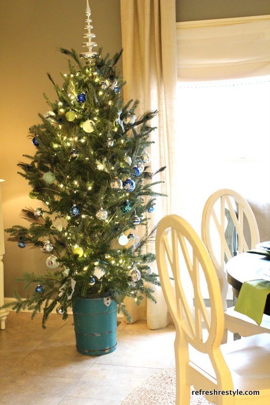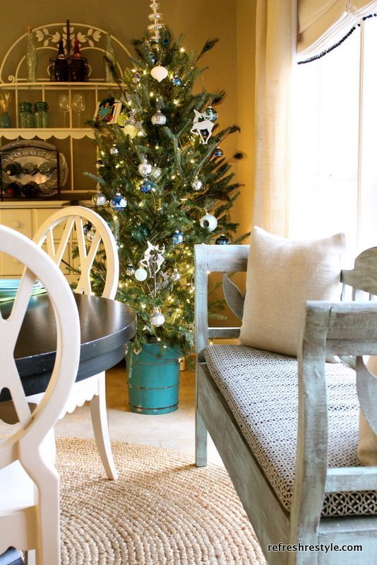 A small farmhouse kitchen needs a Christmas Tree in an Ice Cream churn bucket. And if the ice cream churn bucket is aqua or turquoise that’s even better!