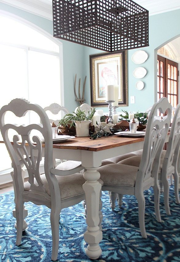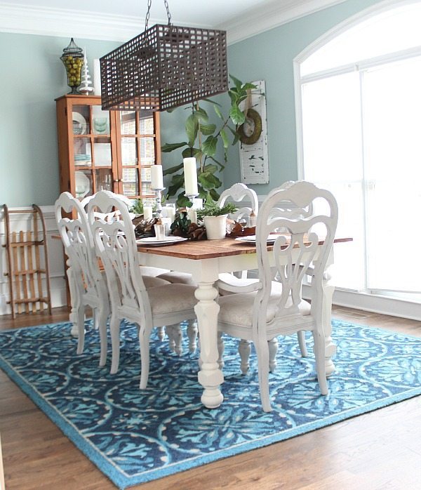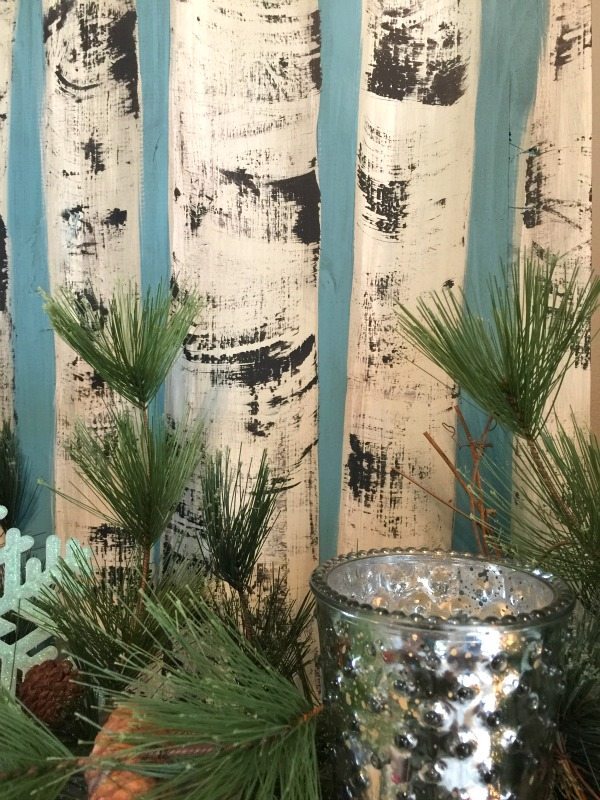 The oil rubbed bronze deer on the left and right are yard sale finds and even though they are not the same, they created the symmetry that I wanted. You don’t have to be matchy – matchy unless it would drive you crazy! The back of the bookcases and dining room are painted SW Quietude and the walls of living room are SW Comfort Gray. One of my favorite colors, it looks different throughout the day. To bring more of the aqua on the the mantel, I painted birch trees on wood, DIY instructions coming soon!