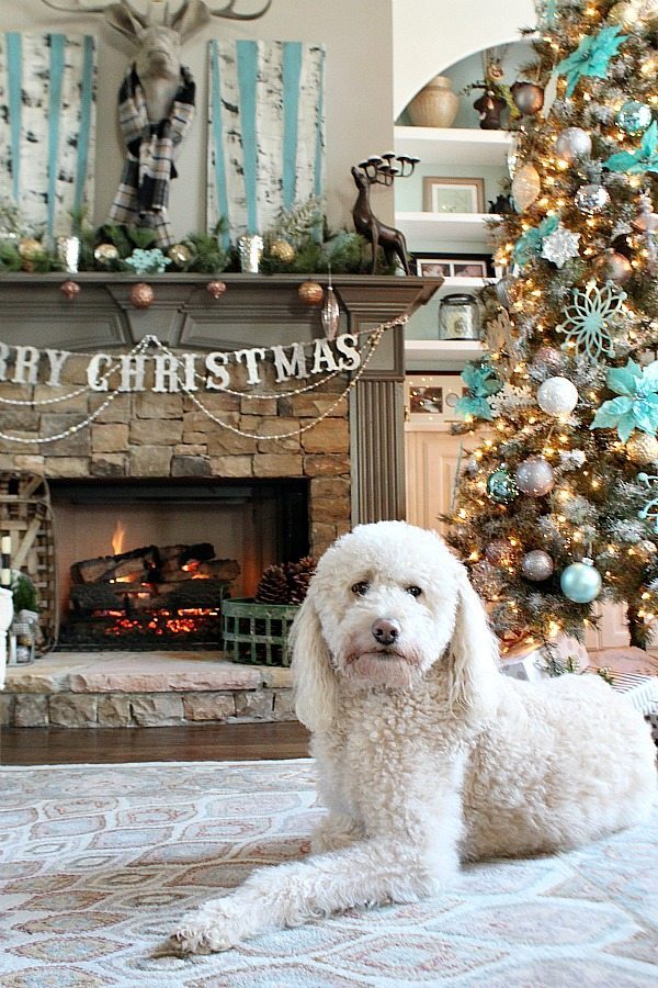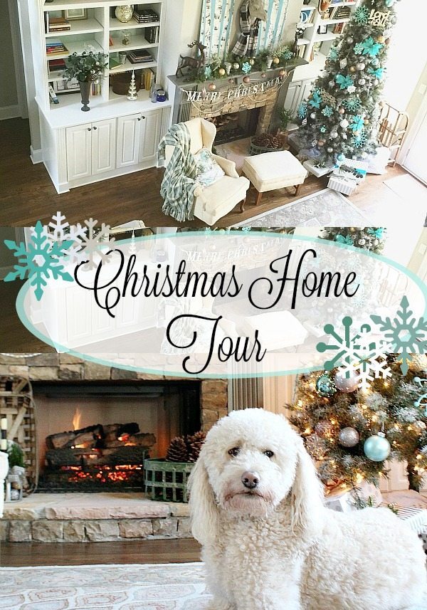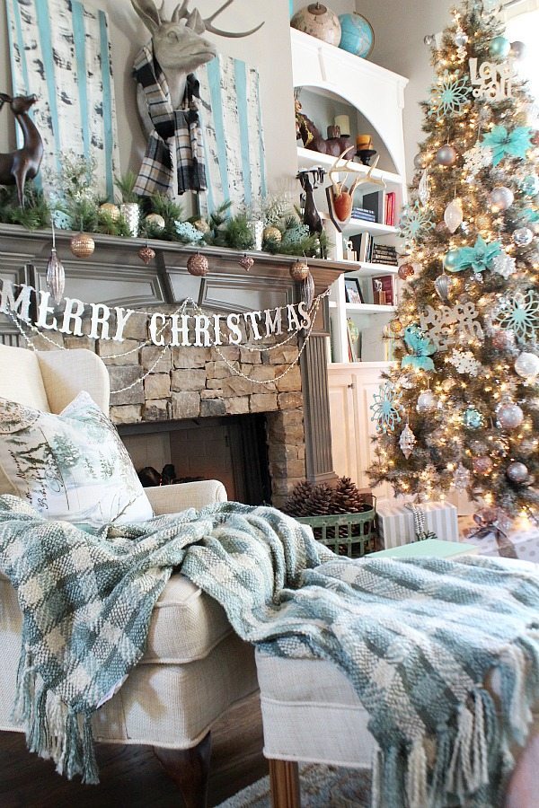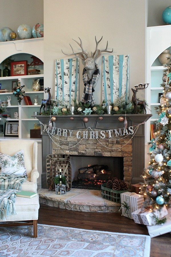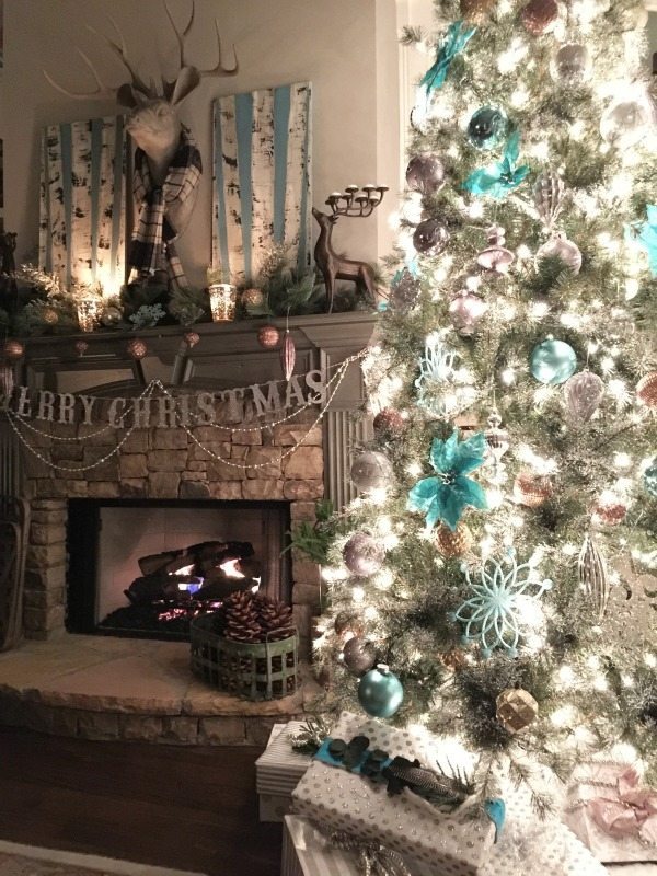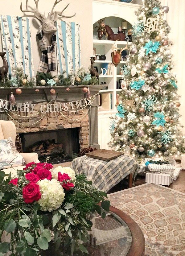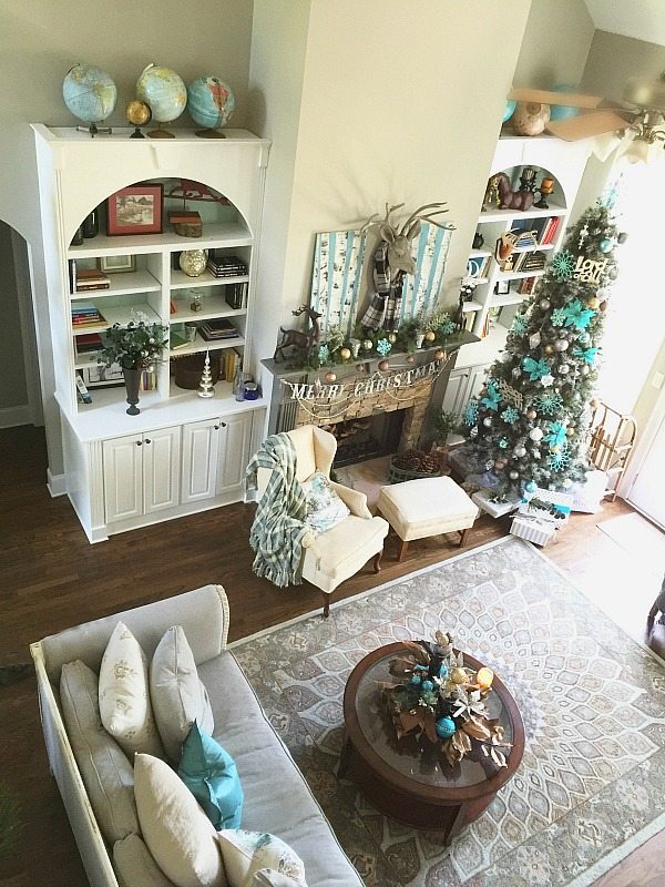 Normally I stick with one color scheme but this year I got a little cray-cray. Our main living areas are decorated in shades of blue with sparklesย of silver, gold and pewter. Blue was a natural color choice since most of the decor and some of the walls are painted blue in these spaces.