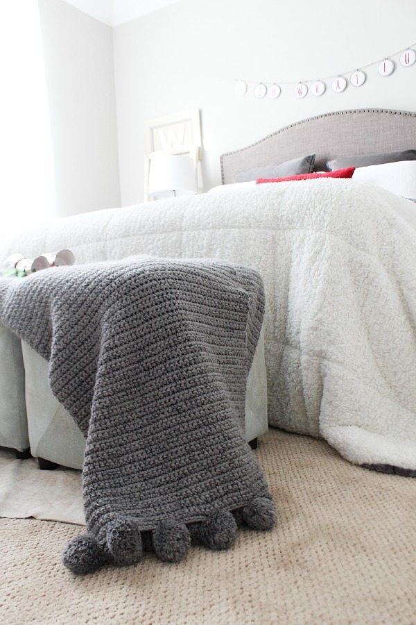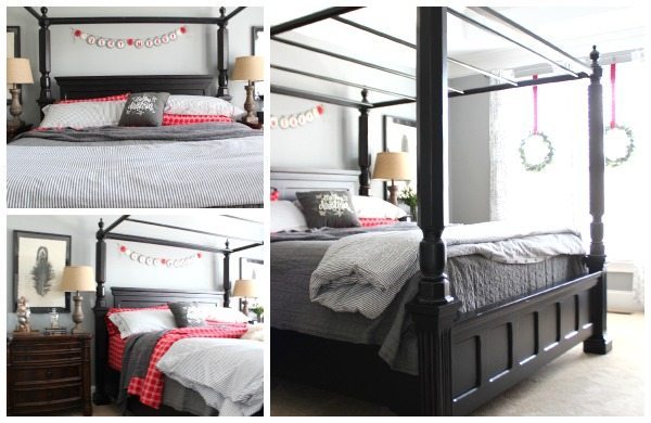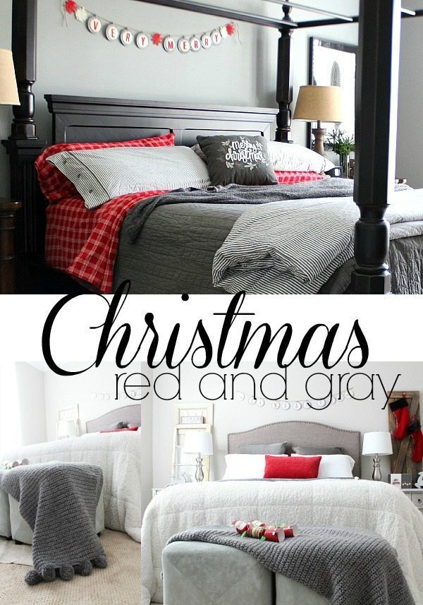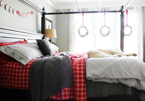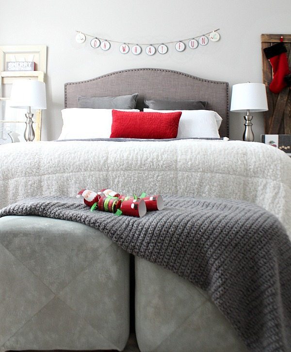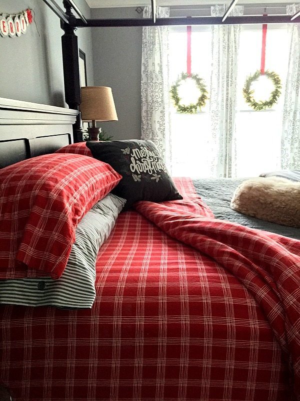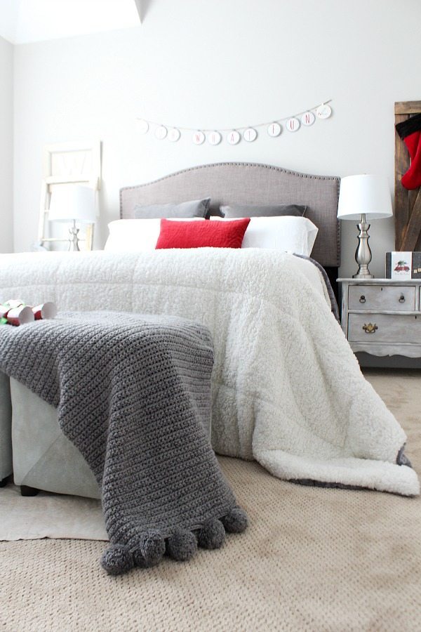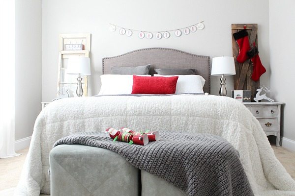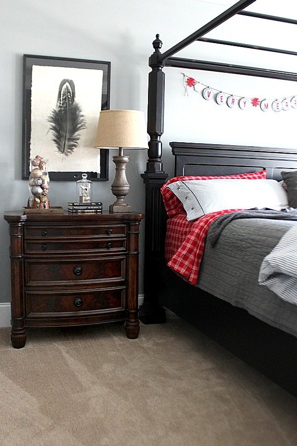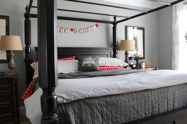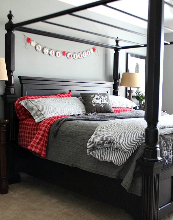 I added red accents to our gray bedroom. The red flannel sheets are a first for us! We have really been missing out, who knew flannel sheets wereย so awesome? The Very Merry banner is from our mantel last year. It only takes a few items to bring the Christmas spirit in to any space!