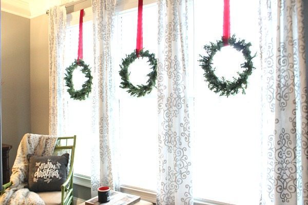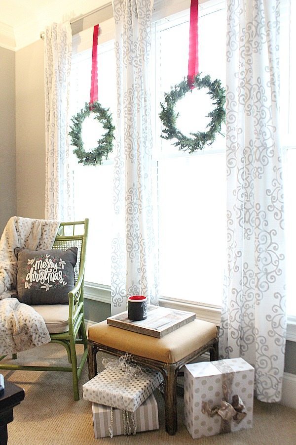 The addition of simple wreaths hung from velvet ribbons put the final touch on the bedroom decor. (My model is laying down on the job!)