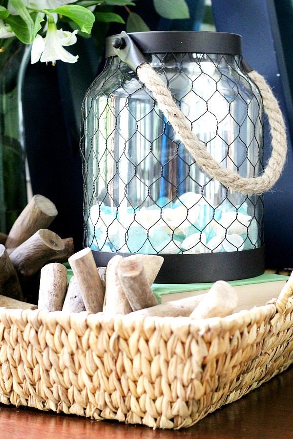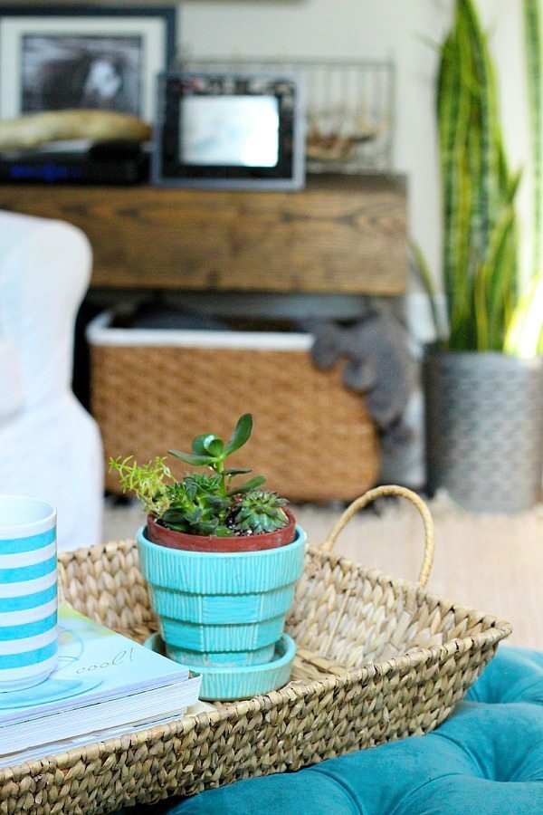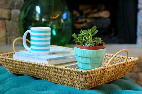 This woven basket tray moves around the house and takes on many different jobs. This winter it was on the aqua ottoman, it kept magazines and books corralled. It was a great place to set your coffee cup too! Currently it’s on the entry table, holding a collection of beachy items. You can use a tray to show off any of your collections. Perfect for organizing your special finds.