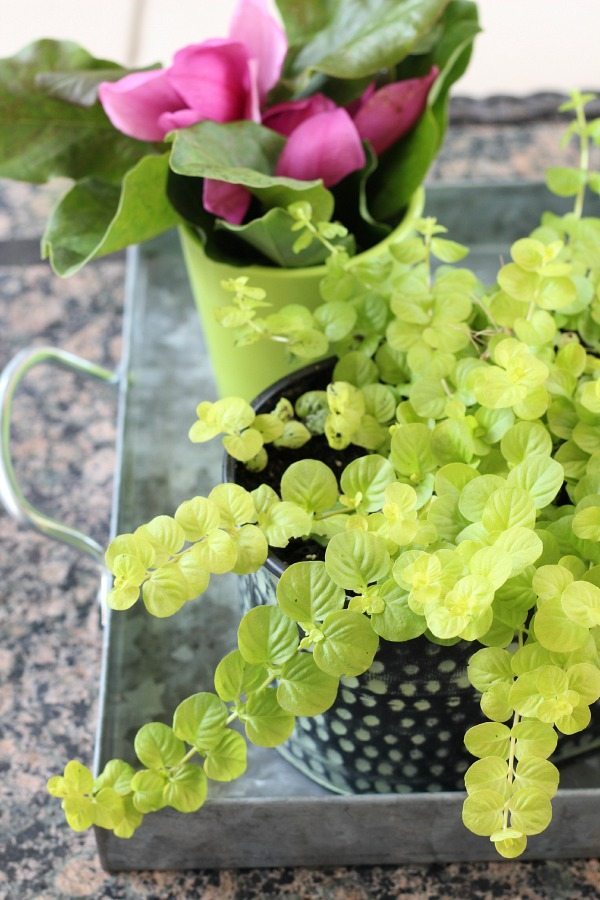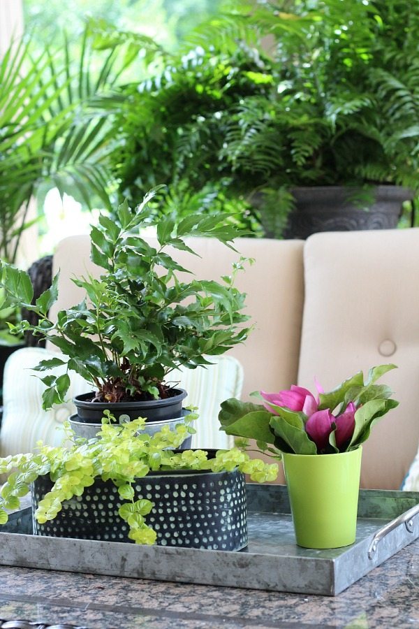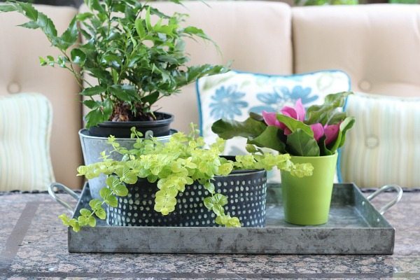 This galvanized metal tray is one of my oldest and favorites. It’s been around for over 17 years. I use it inside and out, here I have several plants displayed on the patio.