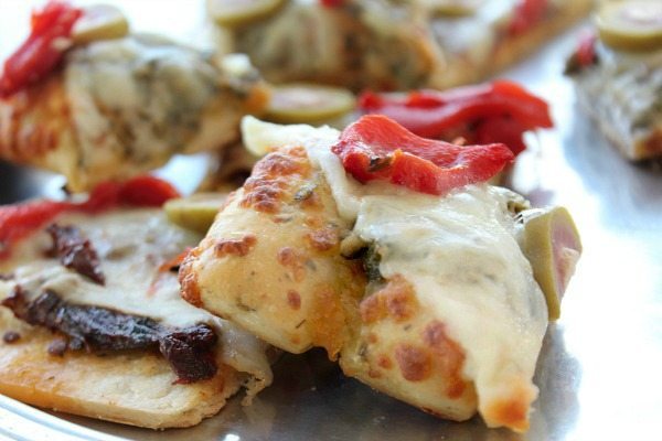 This recipe is so easy and versatile, you will want to try all the crust options. For these I used pizza flat bread and cheese bread sticks, layered with a pesto base and sun dried tomatoes. (You don’t know this about me but I can almost eat both of those by the spoonful…but I didn’t.)