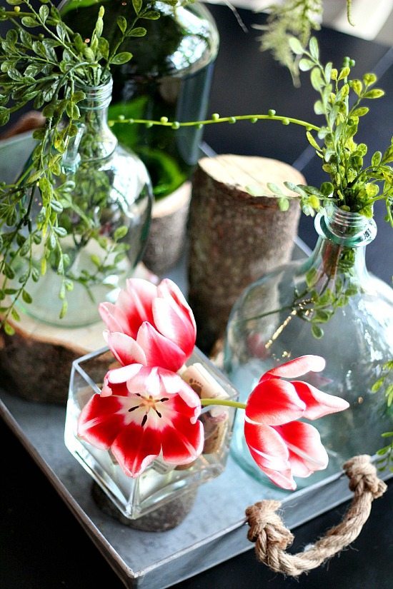 Debbie your photos are absolutely gorgeous! I love the pretty tray and all of the different elements, from the stumps to the bottles and the beautiful flowers!