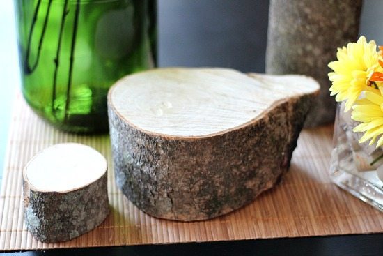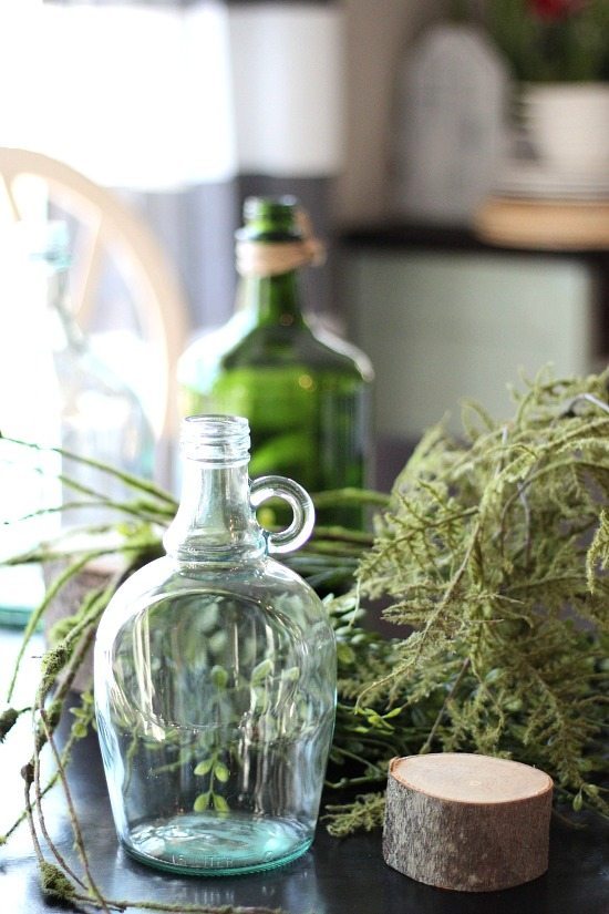 I seperated the greenery between the three recycled wine bottles and elevated two of the bottles by placing them on top of the stumps. These were left over from my Dollar Tree project, you can see the here.
