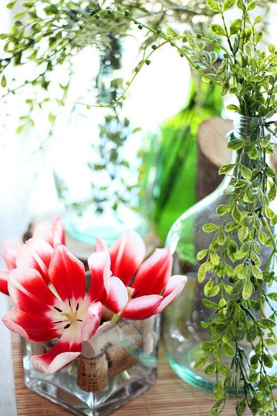 I used a square glass vase to hold the tulips, stuffed with wine corks instead of a flower frog.