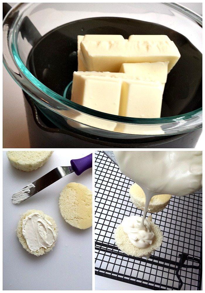 - Pour melted chocolate over the cakes and use a knife to smooth the chocolate over the cake and [br]sides.