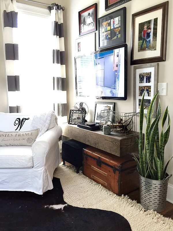 Our family room is a cozy spot, I guess you would say it’s pretty small…in order to have as much seating as possible and to accommodate the tv components, we built a custom shelf. This wasn’t our first option, we started out with a couple different pieces of furniture, none of which really worked for the space.
