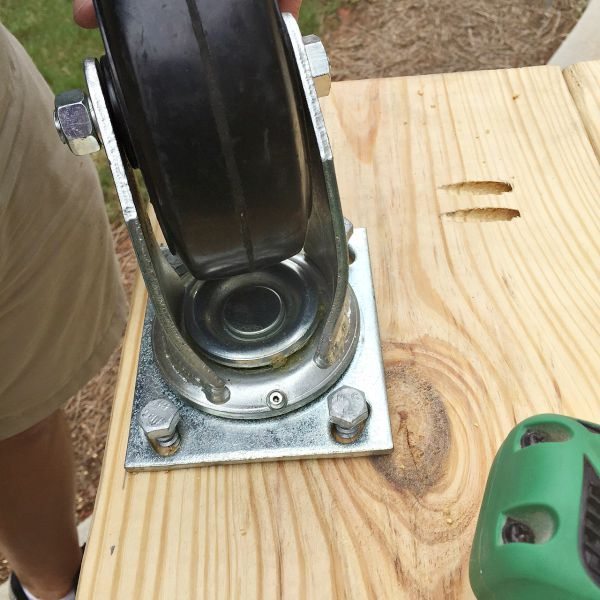 We had the guys at Lowe’s cut the (4) 2″ x 10″ for us to 7′ long and we used the Kreg Jig to drill pocket holes to join the boards. We created 2 sets of shelves, so that we would have an upper and lower shelf. The jig makes it easy, you just set the depth (you set – see the gray section of the jig – the size of wood you’re using and slide to determine the depth of your pocket hole – ours was 2″) clamp on the jig and drill to the stop. I purchased a variety set of Kreg screws and that’s what we used to join the boards. I cleaned the 18″ black pipe nipples and attached the floor flanges to each end. We used bolts to attach the flanges to the bottom shelf about 1 1/2″ in on each end and centered the other 2, flipped it over and attached them to the top. While we had the piece upside down, we attached the heavy duty casters. After we admired our handy work for a few minutes 😉 I stained the piece.