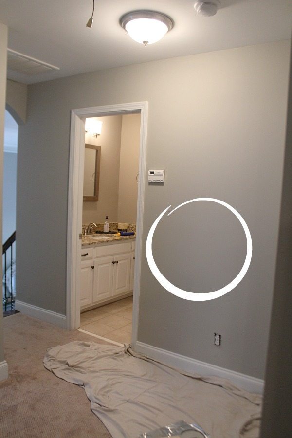 This is the area at the top of the stairs. I didn’t have the original can of paint. I painted one whole wall, from edge to edge, I didn’t want to risk the paint not matching. Luckily, we had this paint left over from the basement project. It’s Sherwin Williams Mindful Gray. One of my favorite colors, right now anyway.