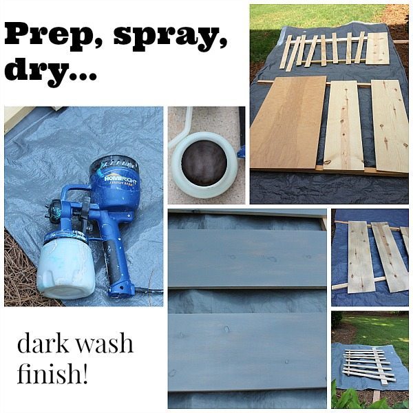 I decided that I wanted the paint to be a gray-wash on some surfaces. I sprayed these with a watered down gray color using my HomeRight Finish Max. Before the paint was dry I wiped it with an old t-shirt.
