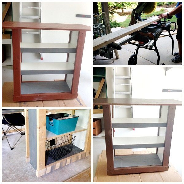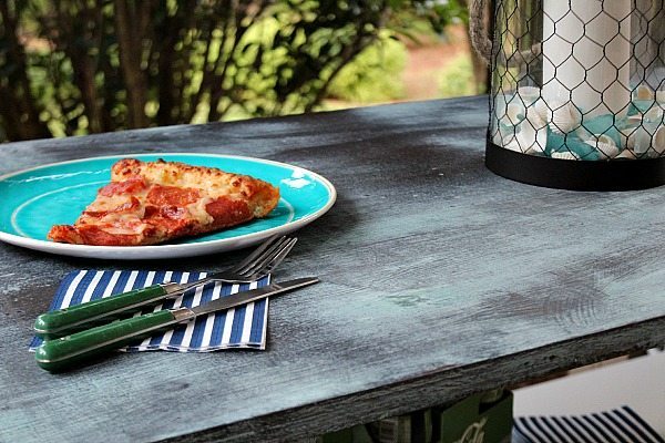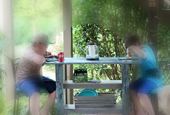 The bar table is waiting for the basement to be finished, but my grandsons couldn’t wait to enjoy that pizza! I’m looking forward to fun times in the man-cave at the industrial bar table made from a bookcase!