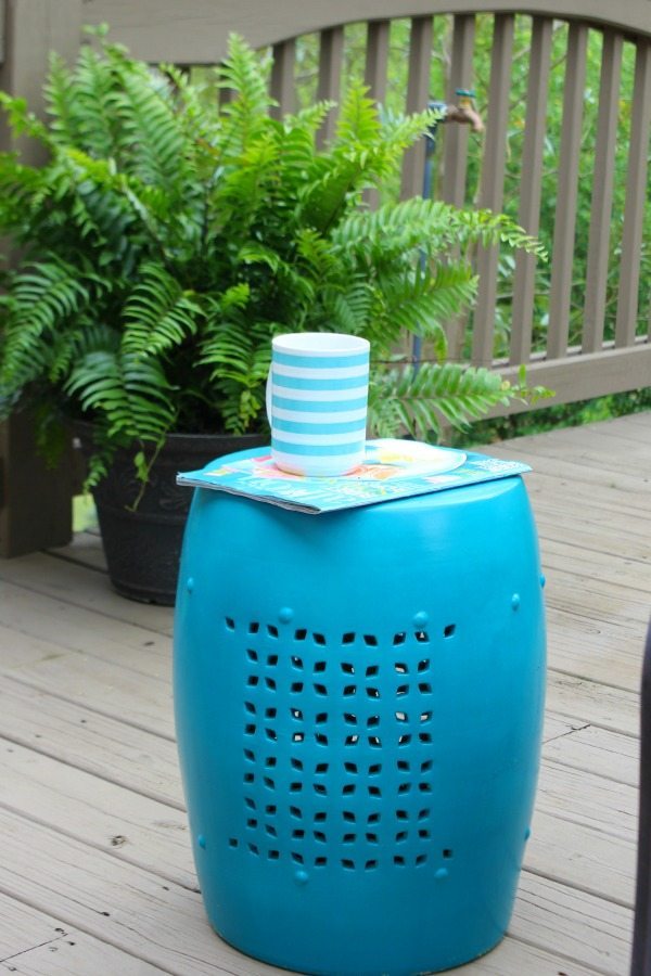 - Find items at Goodwill, that you spray paint with outdoor paint like this garden stool.