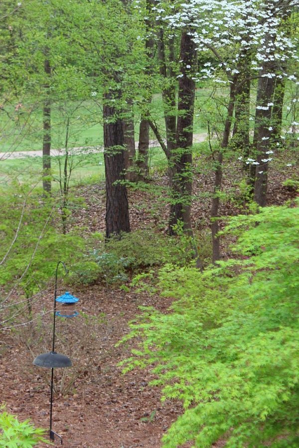 Don’t forget about the birds when you’re prepping your outdoor space. I added a cute bird feeder in the wooded area. I’ve seen beautiful cardinals and blue birds.