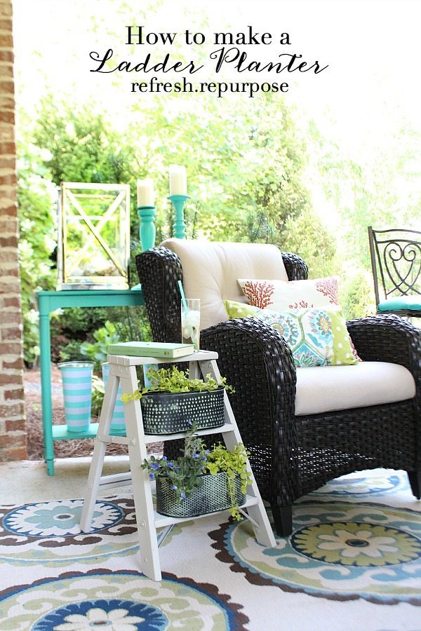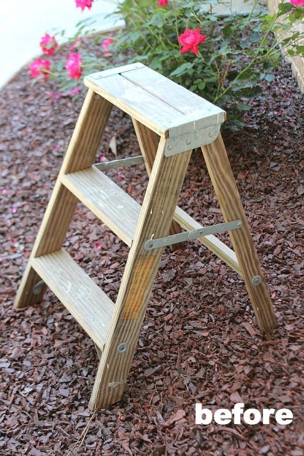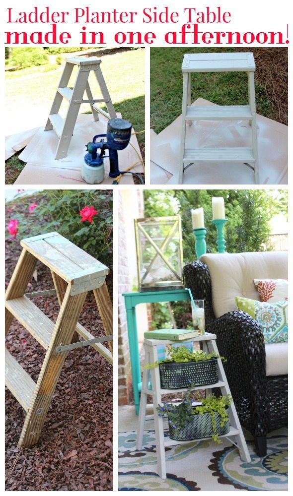 I have a small step ladder found in my grandfather’s shed that I have used as a side table for years. It could use a new paint job. Your planter ladder is great.