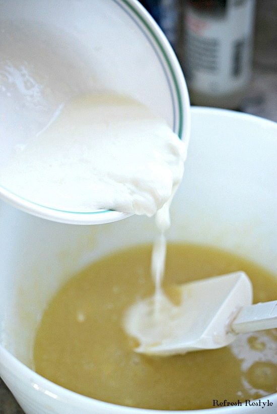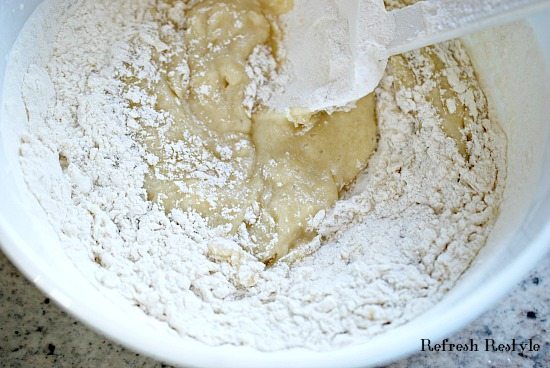 - Add in the egg, flour, baking powder, and baking soda.