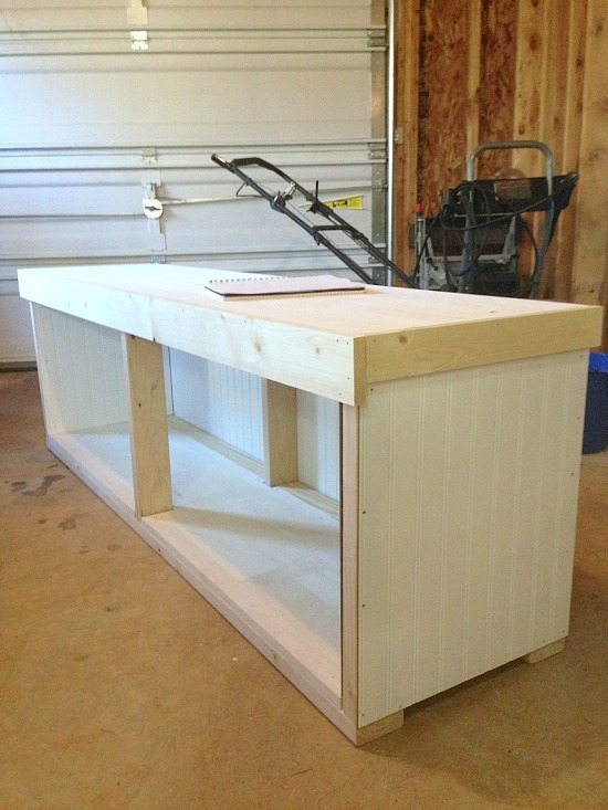We measured the area in the garage and got started with our 2″ x 4″ rectangular box. The idea was to create a base and cover the outside with bead board. Using glue and the Kreg R3 Jr. Pocket Hole Jig System, things went together like clockwork. Well almost clockwork, but I won’t discuss that 😉