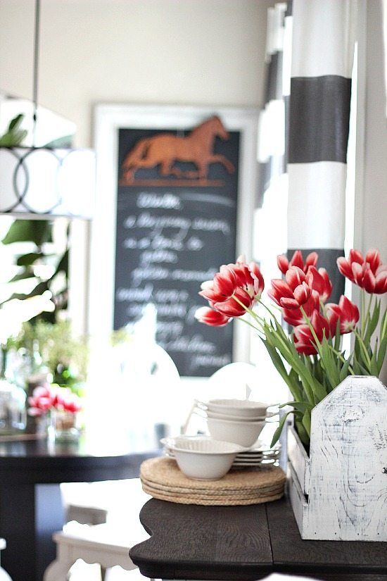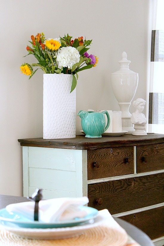 I spread the free spring theme through out the space by adding pieces of white pottery, vases and flowers on the dresser turned side board.