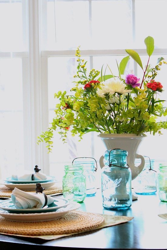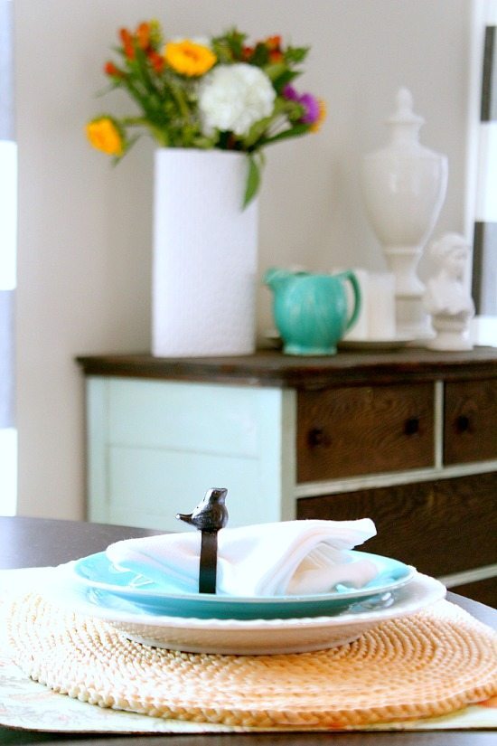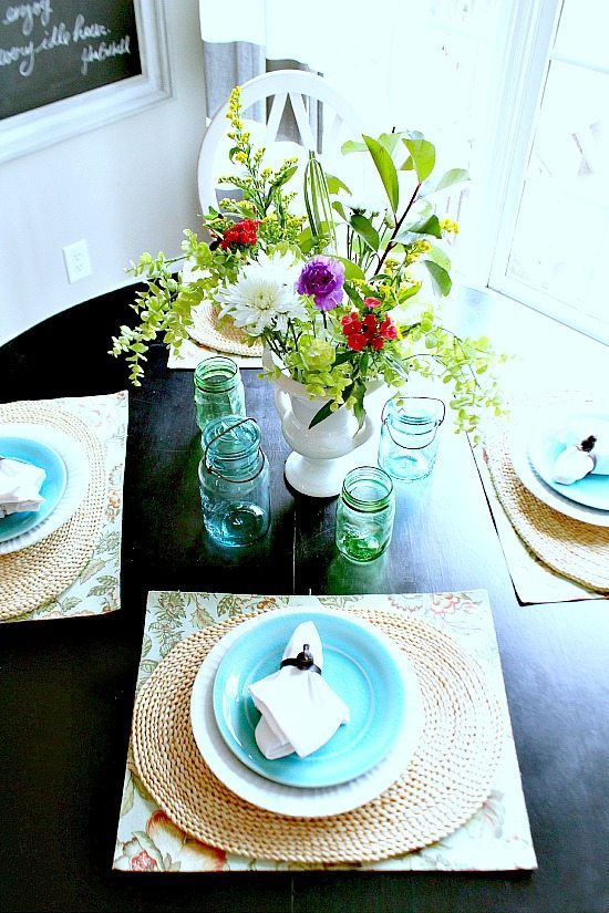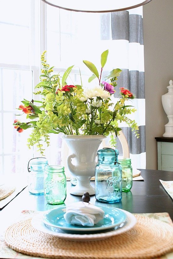 I love any room that has pretty pops of turquoise! Your room looks so fresh and springlike! I love the layered place mats and mason jars!