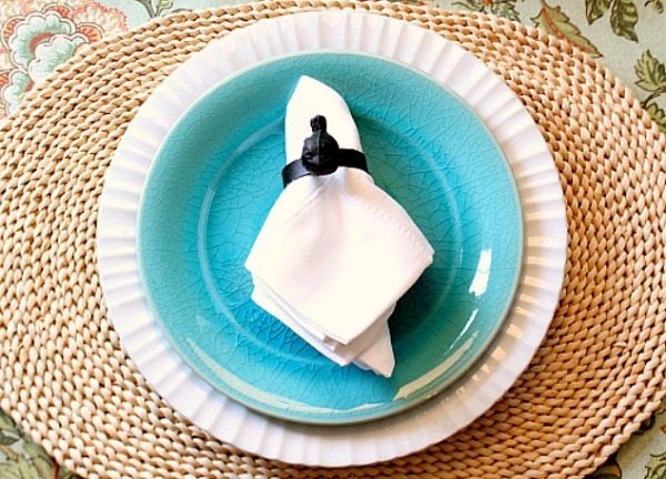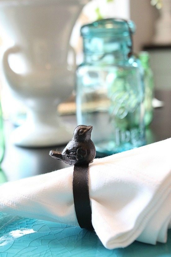 The white plates are what we have used everyday for 15 years! I didn’t even realize it had been that long! I bought the aqua salad plates at Two Women and a Warehouse in Savannah, when I was a vendor there. I layered 2 placemats, grabbed my white napkins and some cute bird napkin rings, all items collected over the last few years.