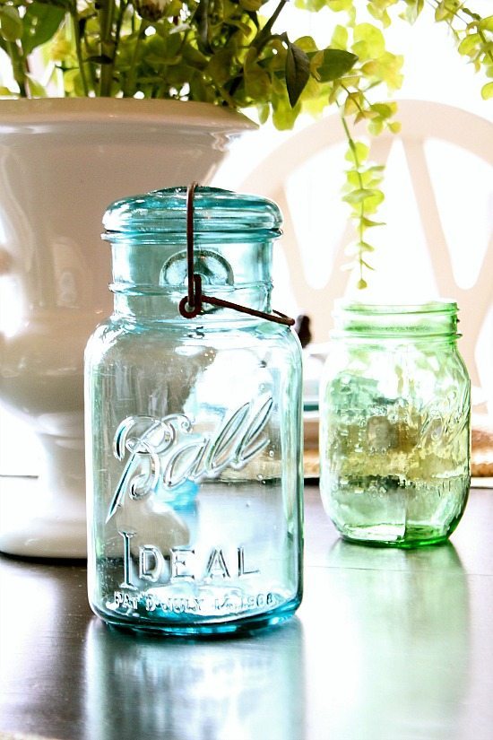 Mason jars are one things that I collect, a few years ago at a yard sale I bought a box of them for $5. There were several blue ones in there! Recently, I’ve seen blue mason jars in every antique/junk store that I’ve been to. The green ones are new, love the way they sparkle in the sunlight.