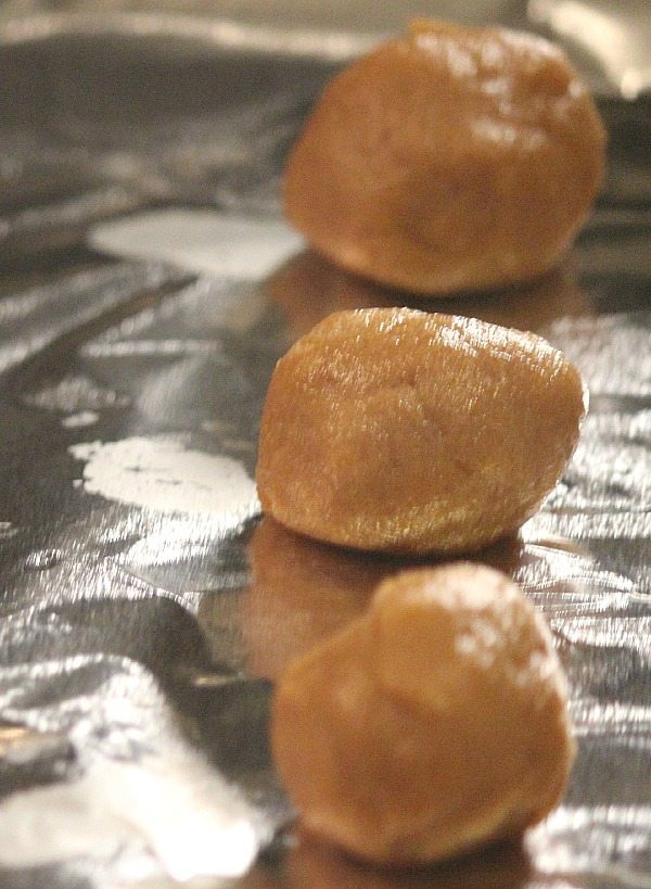 - Roll cookie dough into 1 ½ inch balls and place on a non stick cookie sheet