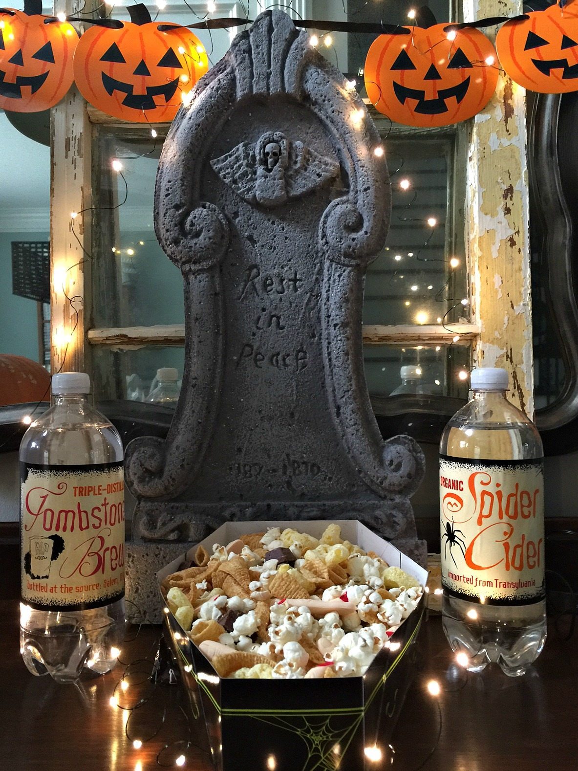 I used Halloween wine labels on bottled water. The Halloween section at Walmart is filled with a lot of fun and creepy Halloween stuff.