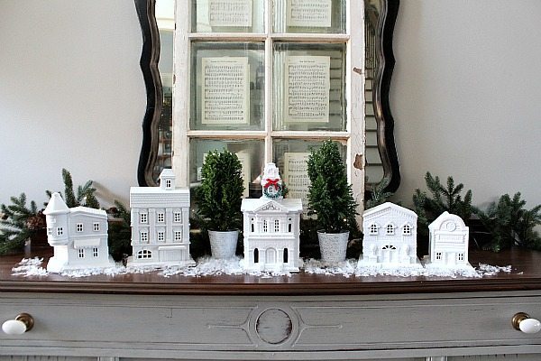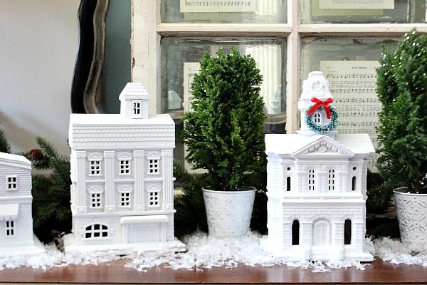 With one can of flat white spray paint, $15 for five building, a couple of trees and messy white snow, my White Christmas village was created!
