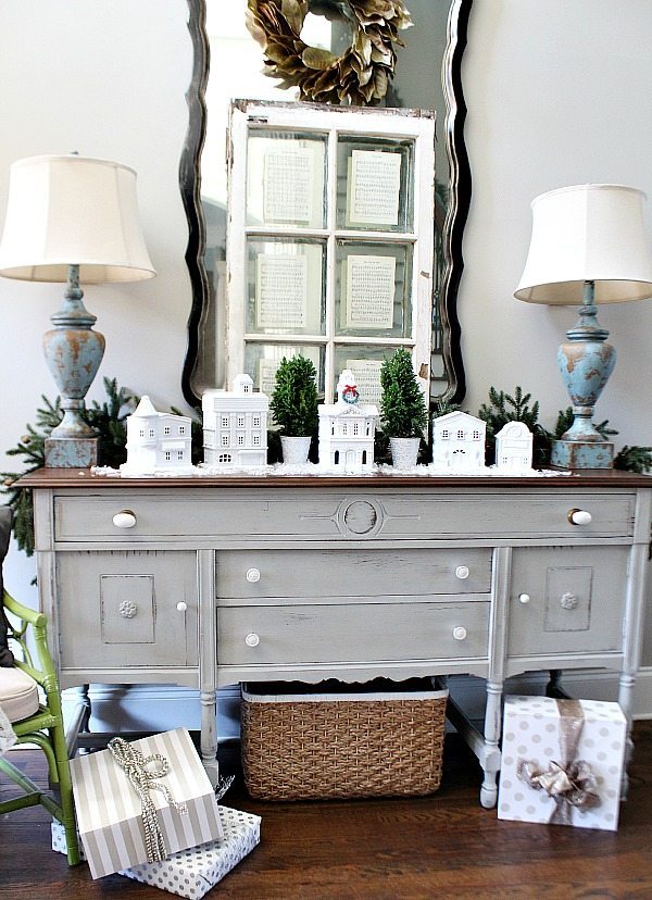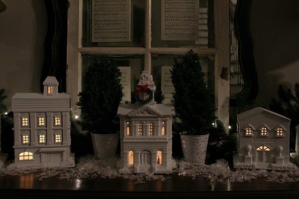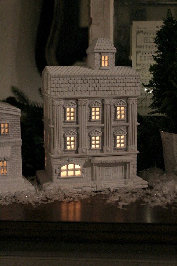 Oh my goodness!! You just solved a dilemma we’ve been having. We inherited my mother in law’s beautiful village 2 years ago but some lights were missing and there are so many I couldn’t find space for all the plugs behind our baker’s rack. Battery tea lights, of course! Thank you. I love how you painted yours all white and snowy. Ours are beautiful painted but I did roll out quilt batting as a snow covered ground.